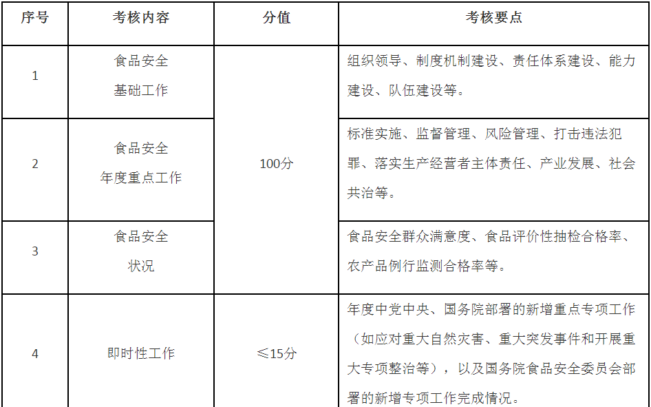 第五條 考核內(nèi)容主要包括食品安全基礎(chǔ)工作推進、年度重點工作落實、食品安全狀況等,同時設(shè)置即時性工作評價和加減分項(考核內(nèi)容要點見附件)。具體考核指標及分值在年度食品安全工作考核方案及其細則中明確,設(shè)置要科學(xué)合理,可操作、可評價、可區(qū)分,切實減輕基層負擔(dān)。