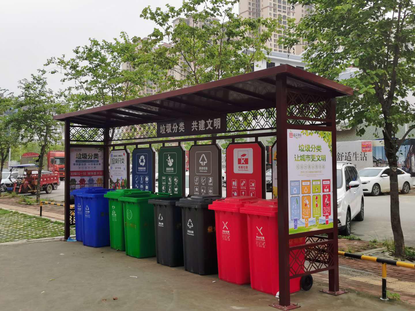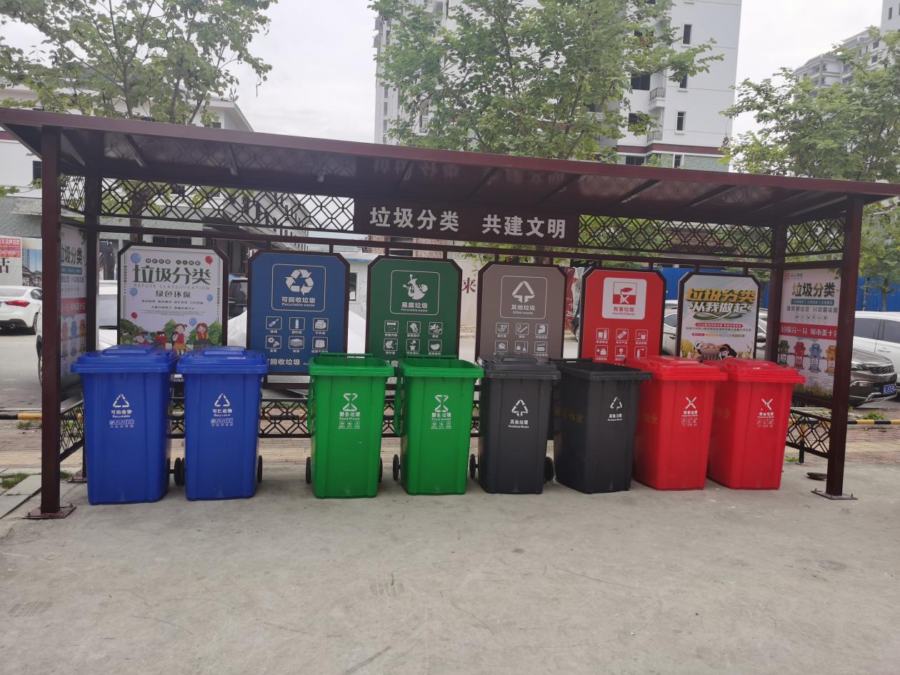 ???????益眾物業(yè)公司在小區(qū)外圍設(shè)置垃圾分類試點2個,投放分類垃圾桶16個。垃圾回收站內(nèi)設(shè)置了可回收垃圾收集箱、有害垃圾收集箱、廚余垃圾收集箱等,居民前來投放垃圾可按垃圾類型進行細分。