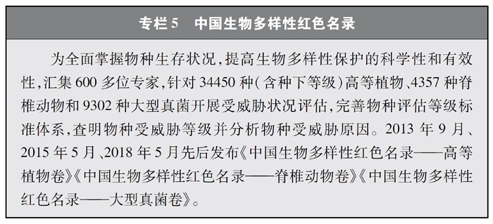 開展全國生物多樣性調(diào)查與評估。大力推進生物多樣性保護重大工程實施,結(jié)合自然資源調(diào)查、生態(tài)系統(tǒng)監(jiān)測評估等工作,不斷完善生物多樣性調(diào)查與評估能力,首次將生物多樣性指標納入生態(tài)質(zhì)量綜合評價指標體系,引導地方加強生態(tài)文明建設(shè)與生物多樣性保護。開展自然資源調(diào)查,包括森林、草原、水、濕地、荒漠、海洋等,建立自然資源調(diào)查評價監(jiān)測制度。構(gòu)建了涵蓋2376個縣級行政單元、樣線總長超過3.4萬公里的物種分布數(shù)據(jù)庫,建立物種資源調(diào)查及收集信息平臺,準確反映野生動植物空間分布狀況。完成長江經(jīng)濟帶、京津冀等國家戰(zhàn)略區(qū)域180多個縣級行政區(qū)生物多樣性調(diào)查與評估。組織開展近海漁業(yè)資源調(diào)查,初步掌握近海漁業(yè)資源狀況。陸續(xù)發(fā)布《中國植物紅皮書》《中國瀕危動物紅皮書》《中國物種紅色名錄》《中國生物多樣性紅色名錄》,基本掌握生物多樣性總體情況,為加強生物多樣性保護奠定了科學基礎(chǔ)。