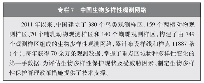 完善監(jiān)測觀測網(wǎng)絡(luò)。中國建立起各類生態(tài)系統(tǒng)、物種的監(jiān)測觀測網(wǎng)絡(luò),在生物多樣性理論研究、技術(shù)示范與推廣以及物種與生境保護方面發(fā)揮了重要作用,為科研、教育、科普、生產(chǎn)等各領(lǐng)域提供了多樣化的信息服務(wù)與決策支持。其中,中國生態(tài)系統(tǒng)研究網(wǎng)絡(luò)(CERN)、國家陸地生態(tài)系統(tǒng)定位觀測研究網(wǎng)絡(luò)(CTERN)涵蓋所有生態(tài)系統(tǒng)和要素,中國生物多樣性監(jiān)測與研究網(wǎng)絡(luò)(Sino BON)覆蓋動物、植物、微生物等多種生物類群,中國生物多樣性觀測網(wǎng)絡(luò)(China BON)構(gòu)建了覆蓋全國的指示物種類群觀測樣區(qū)。