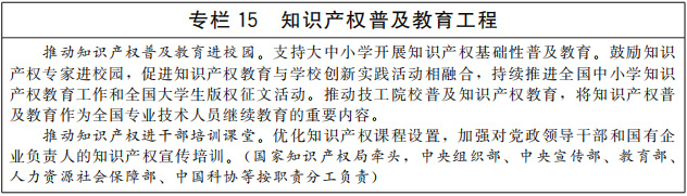 優(yōu)化知識產(chǎn)權(quán)人才發(fā)展環(huán)境。推進知識產(chǎn)權(quán)學(xué)科建設(shè),支持學(xué)位授權(quán)自主審核單位依程序設(shè)置知識產(chǎn)權(quán)一級學(xué)科點,支持有關(guān)單位依程序設(shè)置知識產(chǎn)權(quán)二級學(xué)科點,研究設(shè)置知識產(chǎn)權(quán)碩士專業(yè)學(xué)位。推動知識產(chǎn)權(quán)相關(guān)專業(yè)升級和數(shù)字化改造,開發(fā)一批知識產(chǎn)權(quán)精品課程。鼓勵支持有條件的理工科高校開設(shè)知識產(chǎn)權(quán)相關(guān)專業(yè)和課程。設(shè)立一批國家知識產(chǎn)權(quán)人才培養(yǎng)基地。做好知識產(chǎn)權(quán)職稱制度改革實施工作,完善知識產(chǎn)權(quán)人才評價體系。(教育部、人力資源社會保障部、國家知識產(chǎn)權(quán)局等按職責分工負責)
