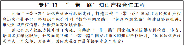 加強知識產(chǎn)權(quán)國際合作機制建設(shè)。鞏固和完善“一帶一路”知識產(chǎn)權(quán)合作,充分利用“一帶一路”知識產(chǎn)權(quán)合作平臺,擴大合作項目規(guī)模和儲備。深度參與金磚國家、中美歐日韓、中日韓、中國—東盟等小多邊知識產(chǎn)權(quán)合作,加強與各方政策和業(yè)務(wù)規(guī)則交流,支持產(chǎn)業(yè)界積極參與相關(guān)合作機制。完善跨境司法協(xié)作安排,加強防范打擊侵犯知識產(chǎn)權(quán)犯罪國際合作。(中央宣傳部、最高人民法院、最高人民檢察院、外交部、公安部、商務(wù)部、海關(guān)總署、國家知識產(chǎn)權(quán)局等按職責分工負責)