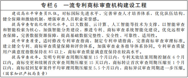 提高知識產(chǎn)權(quán)審查質(zhì)量和審查效率。完善適應(yīng)創(chuàng)新發(fā)展需求的知識產(chǎn)權(quán)審查管理體系,優(yōu)化專利、商標審查協(xié)作機制。提升專利商標審查機構(gòu)能力水平,強化專利、商標、版權(quán)、地理標志、植物新品種全流程審查質(zhì)量管控,提升知識產(chǎn)權(quán)授權(quán)確權(quán)質(zhì)量。提高專利、商標審查業(yè)務(wù)精細化管理水平,優(yōu)化審查資源配置,加強智能化技術(shù)運用,提升審查效能,縮短審查周期。完善專利、商標審查模式,加強審查與產(chǎn)業(yè)發(fā)展的政策協(xié)同和業(yè)務(wù)聯(lián)動,滿足產(chǎn)業(yè)綠色轉(zhuǎn)型和新領(lǐng)域新業(yè)態(tài)創(chuàng)新發(fā)展等社會多樣化需求。(中央宣傳部、工業(yè)和信息化部、農(nóng)業(yè)農(nóng)村部、國家林草局、國家知識產(chǎn)權(quán)局等按職責分工負責)