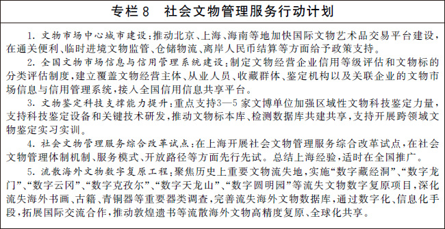 堅持社會效益優(yōu)先,加強對民間收藏的指導、管理和服務,健全文物合法流通交易體制機制,優(yōu)化文物鑒定服務和文物進出境監(jiān)管,完善流失文物追索返還制度。