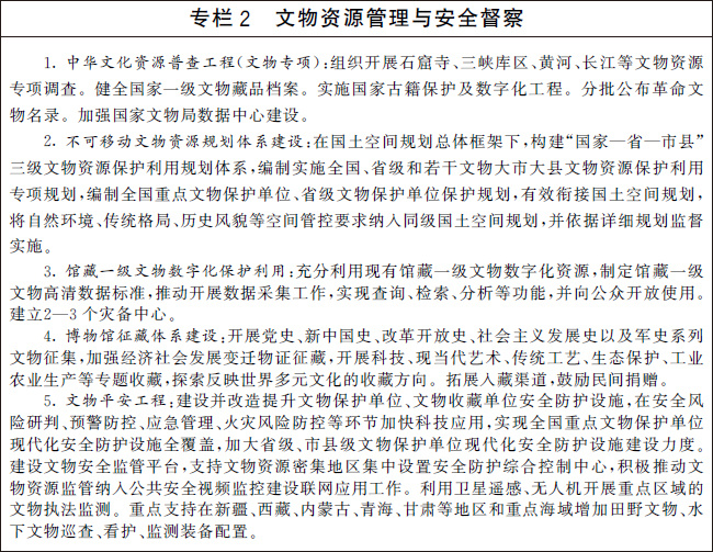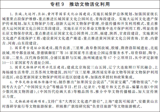 創(chuàng)新文物保護利用機制,加強文物和文化遺產保護利用,建設國家文物保護利用示范區(qū)。健全國有文物資源資產管理制度,推進文物資源資產管理信息共享,部署開展相關試點工作。完善各方主體參與文物保護利用的支持政策,保障利益相關方合法權益。探索創(chuàng)新對文物資源密集區(qū)的支持方式。建設文物領域國家智庫。