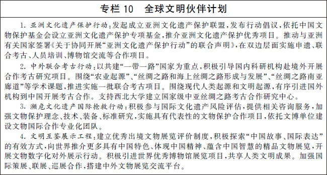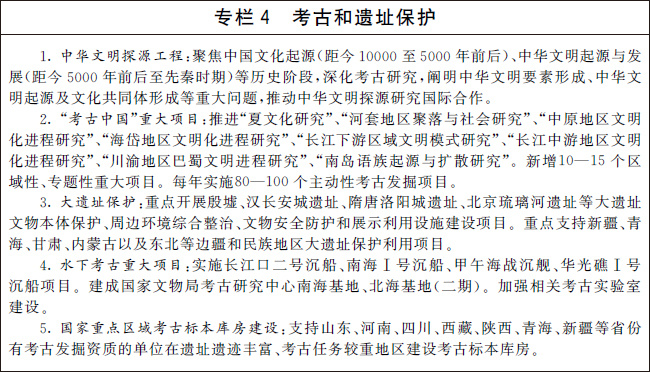 編制并實施“十四五”考古工作專項規(guī)劃。系統(tǒng)確定考古發(fā)掘重點,深化中華文明探源工程,推進“考古中國”重大項目,科學闡釋中國境內人類起源、文明起源、中華文明形成、統(tǒng)一多民族國家建立和發(fā)展、中華文明在世界文明史中的重要地位等關鍵問題,揭示中華文明的歷史文化價值和核心特質。