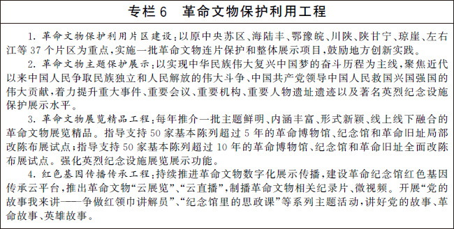 整合文物、黨史、軍史、檔案、地方志等方面研究力量,加強革命文物保護利用研究,開展實物、文獻、檔案、史料和口述史征集,挖掘革命文物深刻內涵,推出重要研究成果,旗幟鮮明反對和抵制歷史虛無主義,繼續(xù)發(fā)揚偉大建黨精神,傳承弘揚井岡山精神、長征精神、遵義會議精神、延安精神、西柏坡精神、紅巖精神、抗美援朝精神、“兩彈一星”精神、特區(qū)精神、抗洪精神、抗震救災精神、抗疫精神、脫貧攻堅精神等偉大精神。