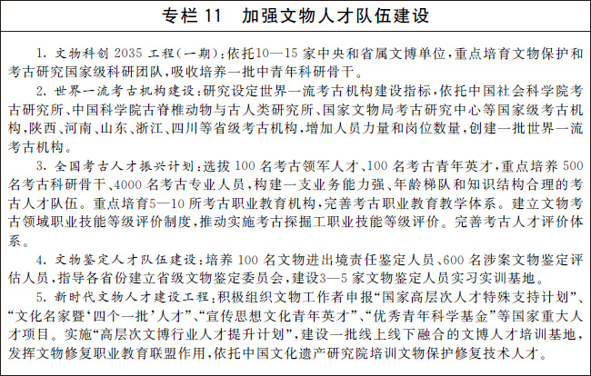 培育一批以領軍人才和中青年骨干創(chuàng)新人才為重點的高層次文物人才,加強考古、科技創(chuàng)新、文物鑒定、文物修復、文物展覽等急需領域人才培養(yǎng),加快建設一支門類齊全、技藝精湛的文物技能人才隊伍,穩(wěn)步造就一支科技研發(fā)能力和技術應用能力過硬的文物科技人才隊伍,錘煉一支熟悉專業(yè)、素質優(yōu)良的文物管理人才隊伍。加強相關行業(yè)文物保護人才培養(yǎng)。