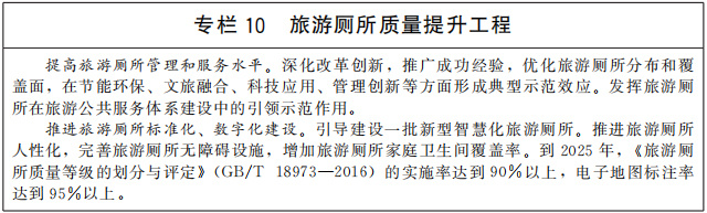 優(yōu)化旅游公共服務設施布局,完善配套設施和功能。適應游客出行方式變化,加大面向散客的旅游公共服務力度。科學規(guī)劃建設旅游景區(qū)停車場、內(nèi)部交通、便民設施、標識標牌等,合理配置廁所、垃圾桶,建設一批示范性旅游廁所,進一步鞏固旅游廁所革命成果。推動文化和旅游公共服務共建共享,探索建設一批文化和旅游綜合服務設施。推動文化服務進旅游景區(qū),在旅游設施、旅游服務中增加文化元素和內(nèi)涵,體現(xiàn)人文關懷。充分考慮特殊群體需求,健全無障礙旅游公共服務標準規(guī)范,加強老年人、殘疾人等便利化旅游設施建設和改造,推動將無障礙旅游內(nèi)容納入相關無障礙公共服務政策。