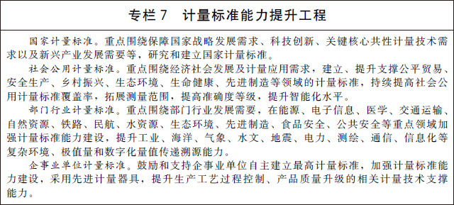 (十九)推進計量標準建設(shè)。改革計量標準體系架構(gòu),統(tǒng)籌考慮技術(shù)能力和現(xiàn)實需求,建立國家計量標準、社會公用計量標準、部門行業(yè)計量標準、企事業(yè)單位計量標準為主體的層次分明、鏈條清晰的計量標準基礎(chǔ)設(shè)施網(wǎng)絡(luò)。實施計量標準能力提升工程,在重點領(lǐng)域新建一批國家計量標準,加快推進各級各類計量標準技術(shù)改造和升級換代。建立嵌入式、芯片級、小型化的計量標準,推動對制造過程的實時在線測量和最佳控制。