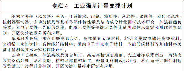 (九)支撐先進制造與質(zhì)量提升。實施制造業(yè)計量能力提升工程,建立一批先進制造業(yè)發(fā)展急需的高準確度、高穩(wěn)定性計量基準、標準。在戰(zhàn)略性新興產(chǎn)業(yè)和現(xiàn)代服務(wù)業(yè)等領(lǐng)域,建設(shè)一批國家產(chǎn)業(yè)計量測試中心和聯(lián)盟,搭建計量公共服務(wù)平臺,聚焦制造業(yè)領(lǐng)域測不了、測不全、測不準難題,加強關(guān)鍵計量測試技術(shù)、測量方法研究和裝備研制,為產(chǎn)業(yè)發(fā)展提供全溯源鏈、全產(chǎn)業(yè)鏈、全壽命周期并具有前瞻性的計量測試服務(wù)。開展產(chǎn)業(yè)計量基礎(chǔ)能力提升行動,實施工業(yè)強基計量支撐計劃,充分發(fā)揮計量對基礎(chǔ)零部件(元器件)、基礎(chǔ)材料、基礎(chǔ)工藝的技術(shù)支撐和保障作用。研究建立國家工業(yè)計量基礎(chǔ)數(shù)據(jù)庫,加強工業(yè)制造領(lǐng)域計量檢定、校準、測試和檢測數(shù)據(jù)的采集、管理和應(yīng)用。