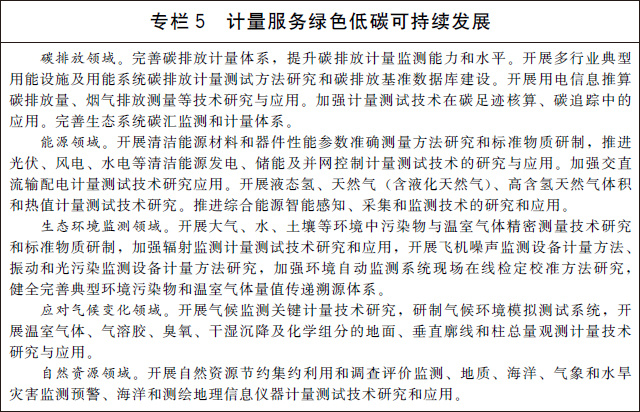(十四)支撐碳達峰碳中和目標實現(xiàn)。完善溫室氣體排放計量監(jiān)測體系,加強碳排放關(guān)鍵計量測試技術(shù)研究和應(yīng)用,健全碳計量標準裝置,為溫室氣體排放可測量、可報告、可核查提供計量支撐。建立碳排放計量審查制度,強化重點排放單位的碳計量要求。在城市和園區(qū)開展低碳計量試點。建立完善資源環(huán)境計量體系,建設(shè)一批國家能源、水文水資源和環(huán)境計量中心,推進能耗、水資源、環(huán)境監(jiān)測系統(tǒng)建設(shè),加強能源資源和環(huán)境計量數(shù)據(jù)分析挖掘和利用。加快推進能源資源計量服務(wù)示范工程建設(shè),引導(dǎo)和培育能源資源和環(huán)境計量服務(wù)市場。