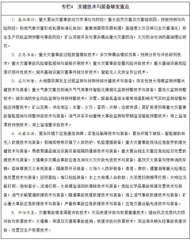 深化應(yīng)用基礎(chǔ)研究。聚焦災(zāi)害事故防控基礎(chǔ)問(wèn)題,強(qiáng)化多學(xué)科交叉理論研究。開(kāi)展重大自然災(zāi)害科學(xué)考察與調(diào)查。整合利用中央和地方政府、企業(yè)以及其他優(yōu)勢(shì)科技資源,加強(qiáng)自主創(chuàng)新和“卡脖子”技術(shù)攻關(guān)。實(shí)施重大災(zāi)害事故防治、重大基礎(chǔ)設(shè)施防災(zāi)風(fēng)險(xiǎn)評(píng)估等國(guó)家科技計(jì)劃項(xiàng)目,制定國(guó)家重大應(yīng)急關(guān)鍵技術(shù)攻關(guān)指南,加快主動(dòng)預(yù)防型安全技術(shù)研究。