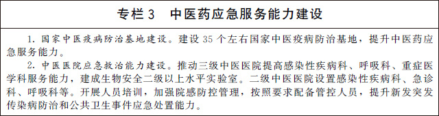 加強中醫(yī)藥應(yīng)急救治能力建設(shè)。依托高水平三級甲等中醫(yī)醫(yī)院,建設(shè)覆蓋所有省份的國家中醫(yī)疫病防治基地,依托基地組建中醫(yī)疫病防治隊伍,提升中醫(yī)緊急醫(yī)學(xué)救援能力。三級公立中醫(yī)醫(yī)院和中西醫(yī)結(jié)合醫(yī)院(不含中醫(yī)專科醫(yī)院)全部設(shè)置發(fā)熱門診,加強感染性疾病、急診、重癥、呼吸、檢驗等相關(guān)科室建設(shè),提升服務(wù)能力。