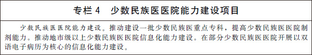 3.發(fā)展少數(shù)民族醫(yī)藥。加強少數(shù)民族醫(yī)醫(yī)療機構(gòu)建設(shè),提高民族地區(qū)基層醫(yī)療衛(wèi)生機構(gòu)少數(shù)民族醫(yī)藥服務(wù)能力。改善少數(shù)民族醫(yī)醫(yī)院基礎(chǔ)設(shè)施條件,加強少數(shù)民族醫(yī)醫(yī)院??颇芰?、制劑能力和信息化能力建設(shè)。建立符合少數(shù)民族醫(yī)醫(yī)療機構(gòu)自身特點和發(fā)展規(guī)律的績效評價指標(biāo)體系。加大少數(shù)民族醫(yī)藥防治重大疾病和優(yōu)勢病種研究力度,有效傳承特色診療技術(shù)和方法。鼓勵和扶持少數(shù)民族醫(yī)藥院校教育、師承教育和繼續(xù)教育。加大對少數(shù)民族醫(yī)藥的傳承保護力度,持續(xù)開展少數(shù)民族醫(yī)藥文獻搶救整理工作,推動理論創(chuàng)新和技術(shù)創(chuàng)新。
